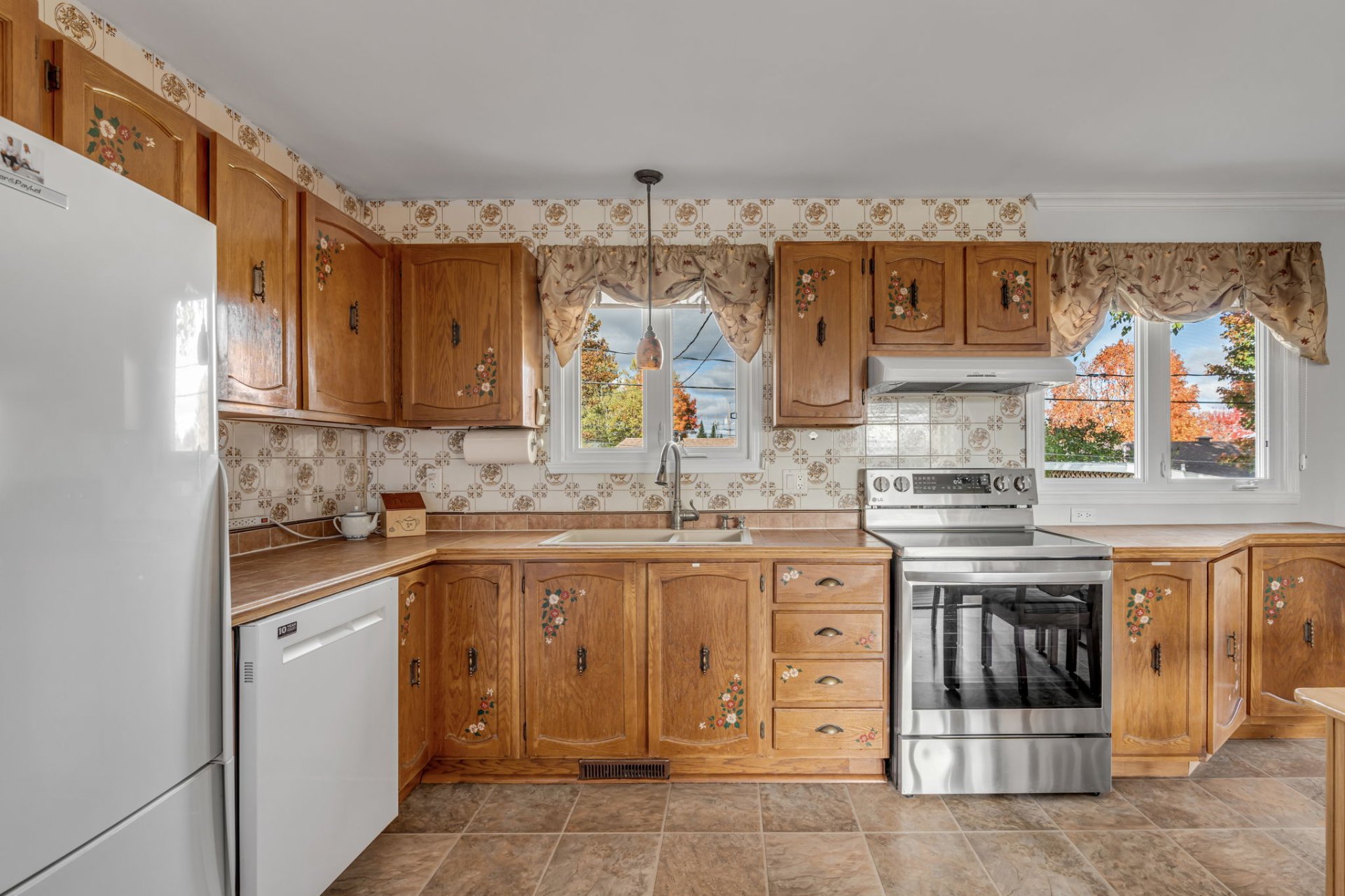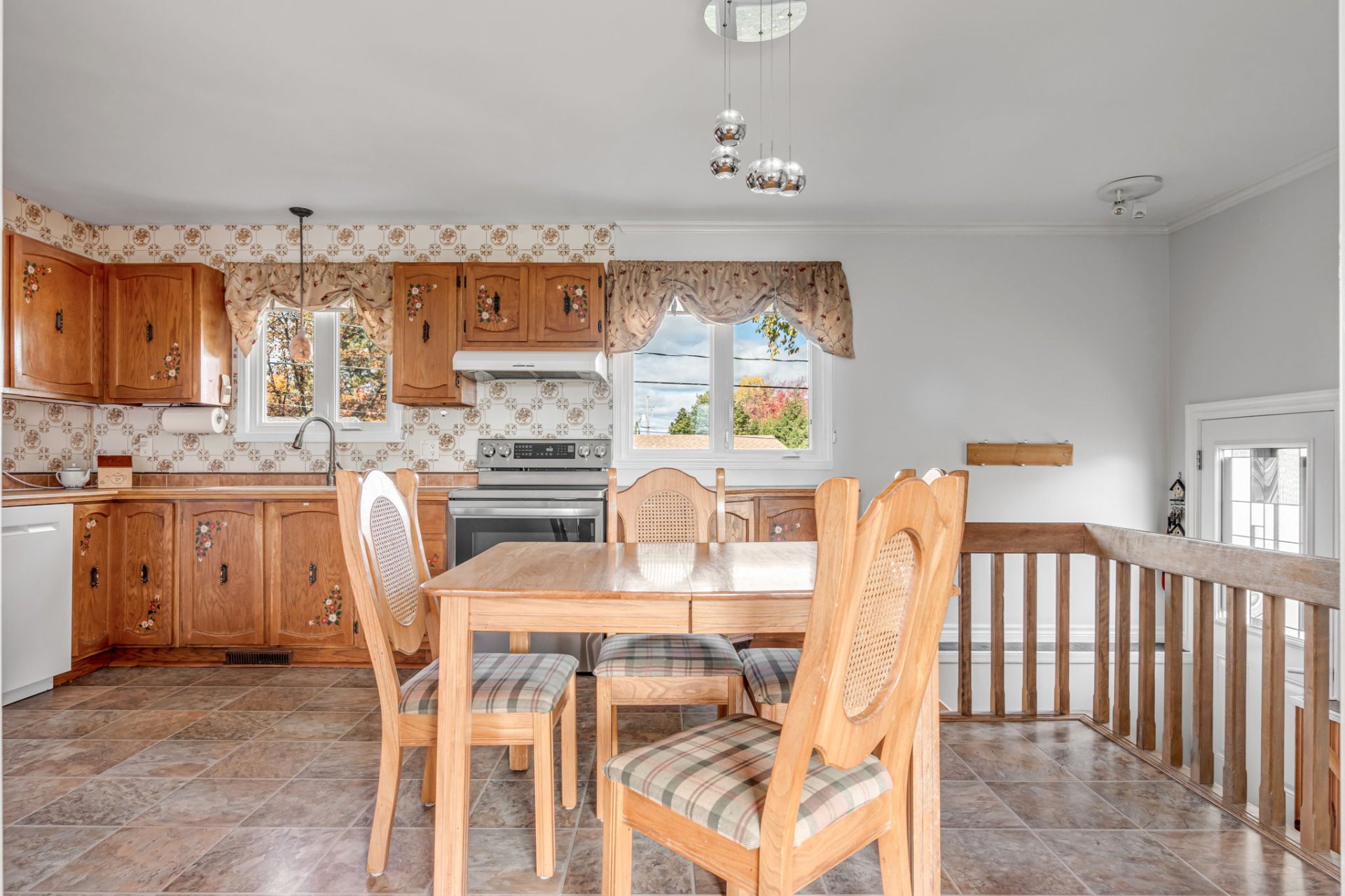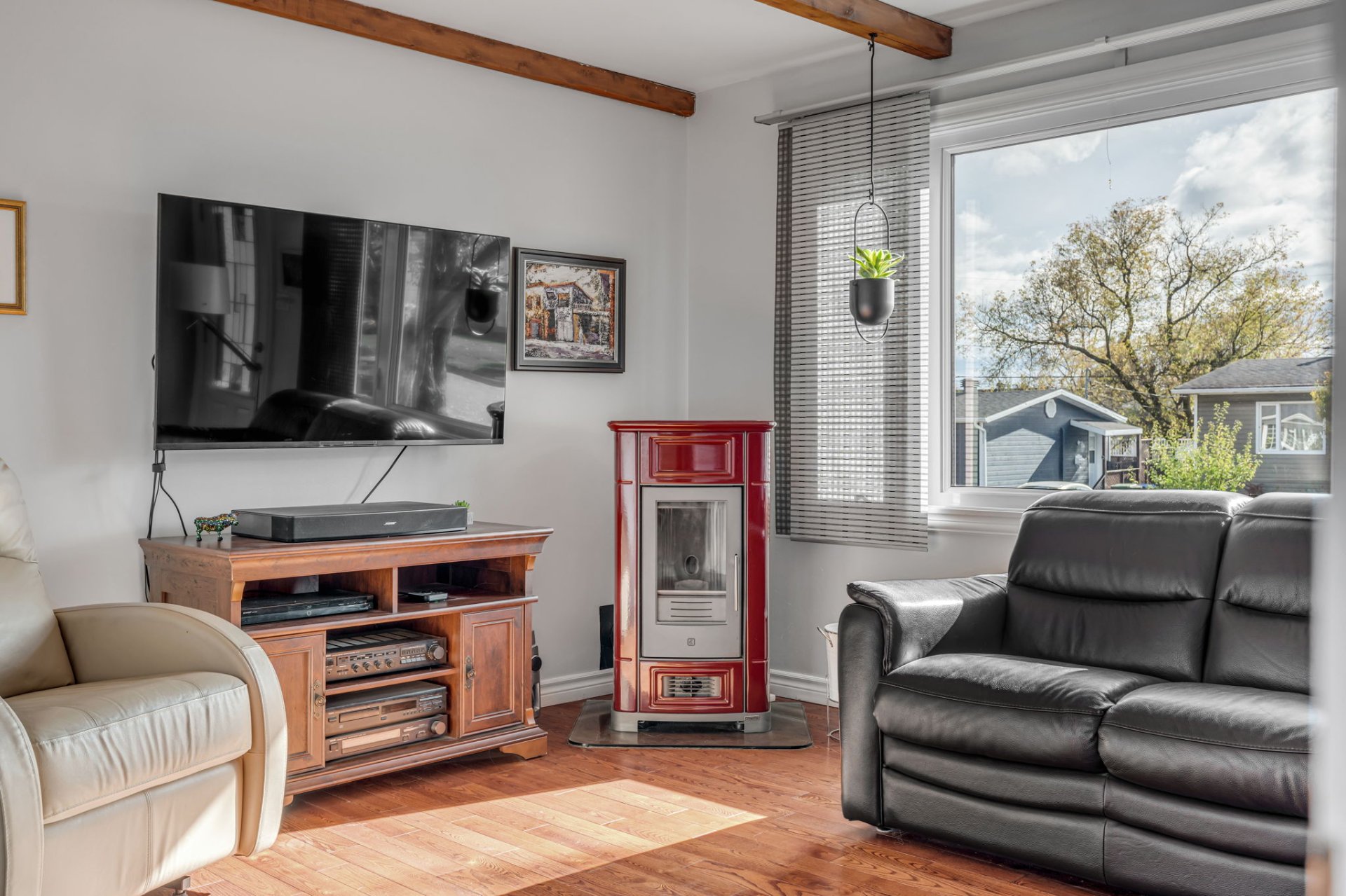 luminaires, toiles et stores, rideaux et tringles, aspirateur central et accessoires, lave-vaisselle, foyer aux granules.